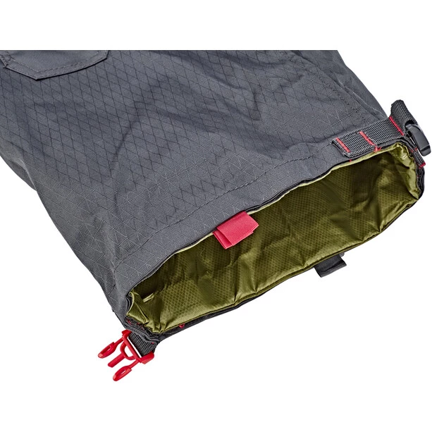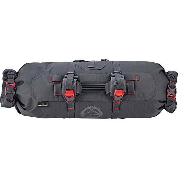 Fabriqué en matériau recyclé Cordura Ripstop Ecomade, le sac Acepac Bar est muni d’une ouverture étanche à l’eau et les fermetures enroulable permettent de varier le volume du sac de 8 à 16 litres maximum, selon les besoins. Les fermetures Duraflex Xlite Easy Access sont faciles à utiliser, même avec des gants, et grâce à un accès des deux côtés, le sac est facile à charger et à décharger. La face inférieure particulièrement sollicitée est protégée par une couche supplémentaire de bâche et une double couche de Cordura Ecomade a été utilisée dans d’autres zones particulièrement sollicitées. Des entretoises sont placées entre le sac et le guidon pour s’assurer que les freins et les engrenages fonctionnent sans aucune interférence. Ce sac est compatible avec la plupart des guidons.