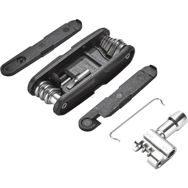 Le Birzman Diversity 17 est un multi-outil pratique avec jeu de démonte-pneus, rivet de chaîne, manomètre de chaîne et raccord de cartouche de CO2 avec tête de valve compatible pour valves Presta et Schrader.