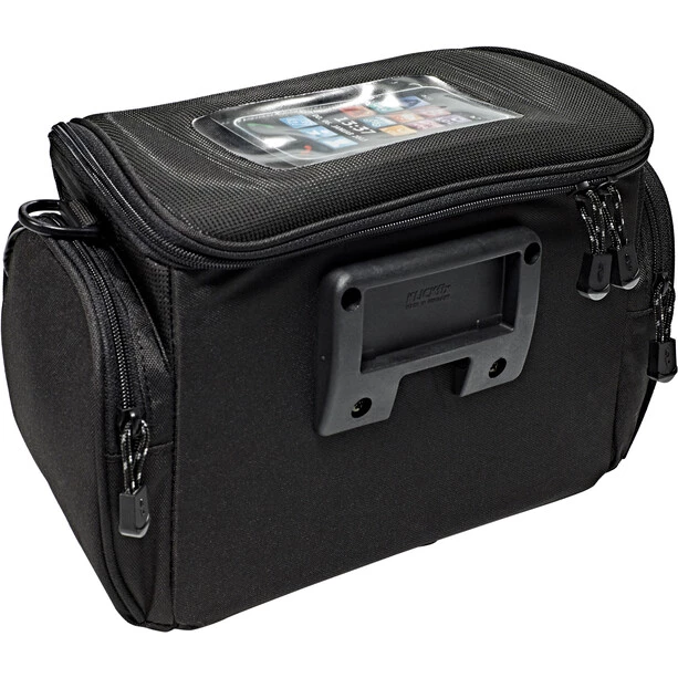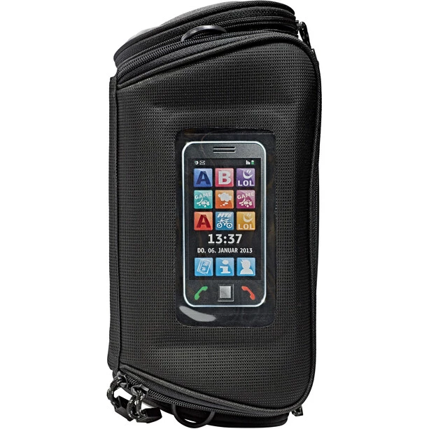 Un sac de guidon moderne avec un compartiment pour smartphone intégré et des poches extérieures pratiques.