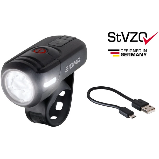 SIGMA offre la sécurité à vélo à un prix raisonnable : le feu avant USB AURA 45 USB est disponible en kit avec le feu arrière NUGGET II. Ensemble, ils assurent une bonne visibilité sur tout le pourtour.