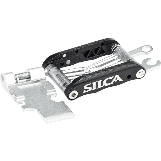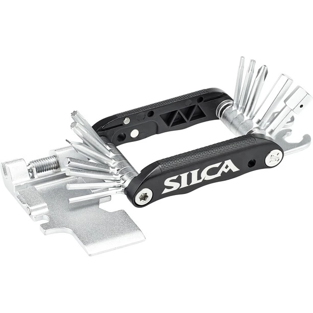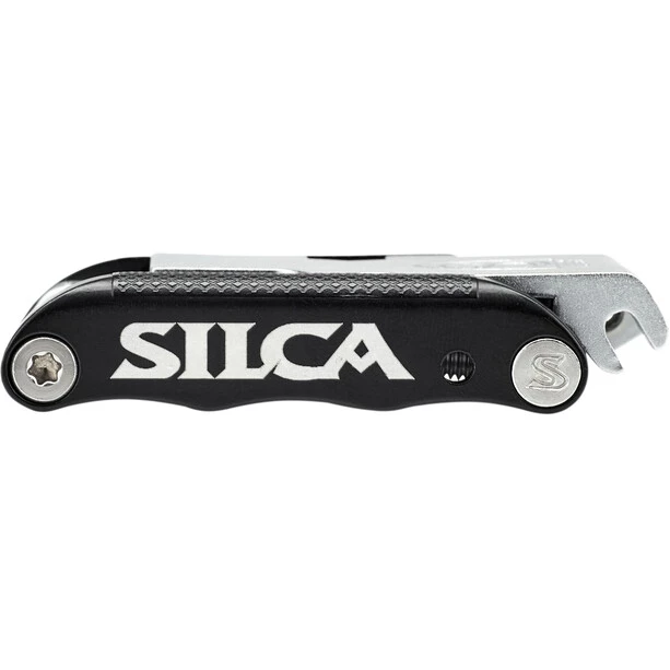 Voilà : le « Knive de l’armée italienne », l’interprétation SILCA-typique du multitool classique. SILCA s’est occupé de ce qui gêne les multi-outils conventionnels et les a mis sous une forme qui s’intègre parfaitement dans le « EOLO Wallet » ou le « Seat Roll Premio ». L' »IAK » combine des outils de longueur moyenne entièrement forgés avec des côtés en aluminium et entièrement en acier inoxydable. La conception de l’outil est assez longue pour atteindre même les éléments fraisés, mais assez courte pour éviter le surenroulement, comme on le sait pour les outils longs. Toutes les pièces sont forgées – une méthode de fabrication plus complexe qui s’amortit rapidement sur la route ! Grâce à leur conception spéciale, les différents outils peuvent être placés les uns à côté des autres, réduisant l’épaisseur de l’IAK d’environ la moitié. Les outils et bagues en acier inoxydable doublement chromé garantissent une longue durée de vie sans corrosion (le tueur numéro 2 pour les multi-outils, couronné par la « perte » numéro 1 !). Les parties latérales en aluminium contiennent des aimants en terres rares pour recevoir un verrou de chaîne de rechange supplémentaire.